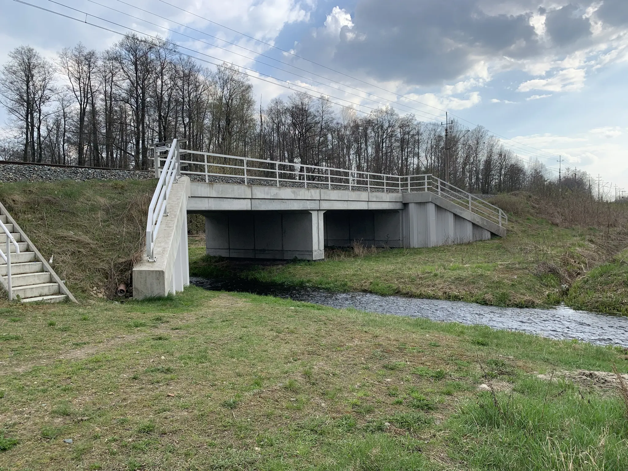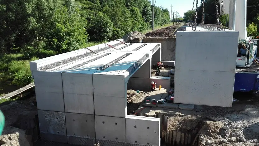 Dwuprzęsłowy most kolejowy wykonany z prefabrykowanych rygli, ścian bocznych oraz ścian środkowych systemu ABM FRAME. Poza standardowymi elementami zastosowano również prefabrykowany kołnierz.